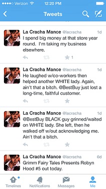There were two male Best Buy employees at both registers, one black, the other was white. There was a white female customer being waited on by the black worker. I was in line behind her. The white employee couldn’t help anyone because his register was processing slowly. Both workers were talking and laughing with the white female customer, while her significant other stood off to the side playing on his phone. The black worker was skinnin’ and grinnin’ so hard, he could barely ring her up. And the white employee held a brief a conversation with the customer in another language.
